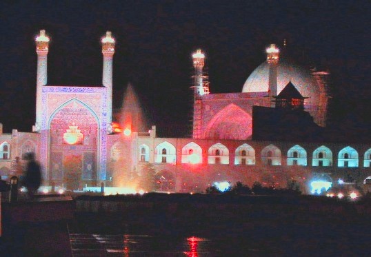 右写真は、本日最初に訪れたマスジェデ・イマームで、ライトアップされた姿は幻想的で美しい。